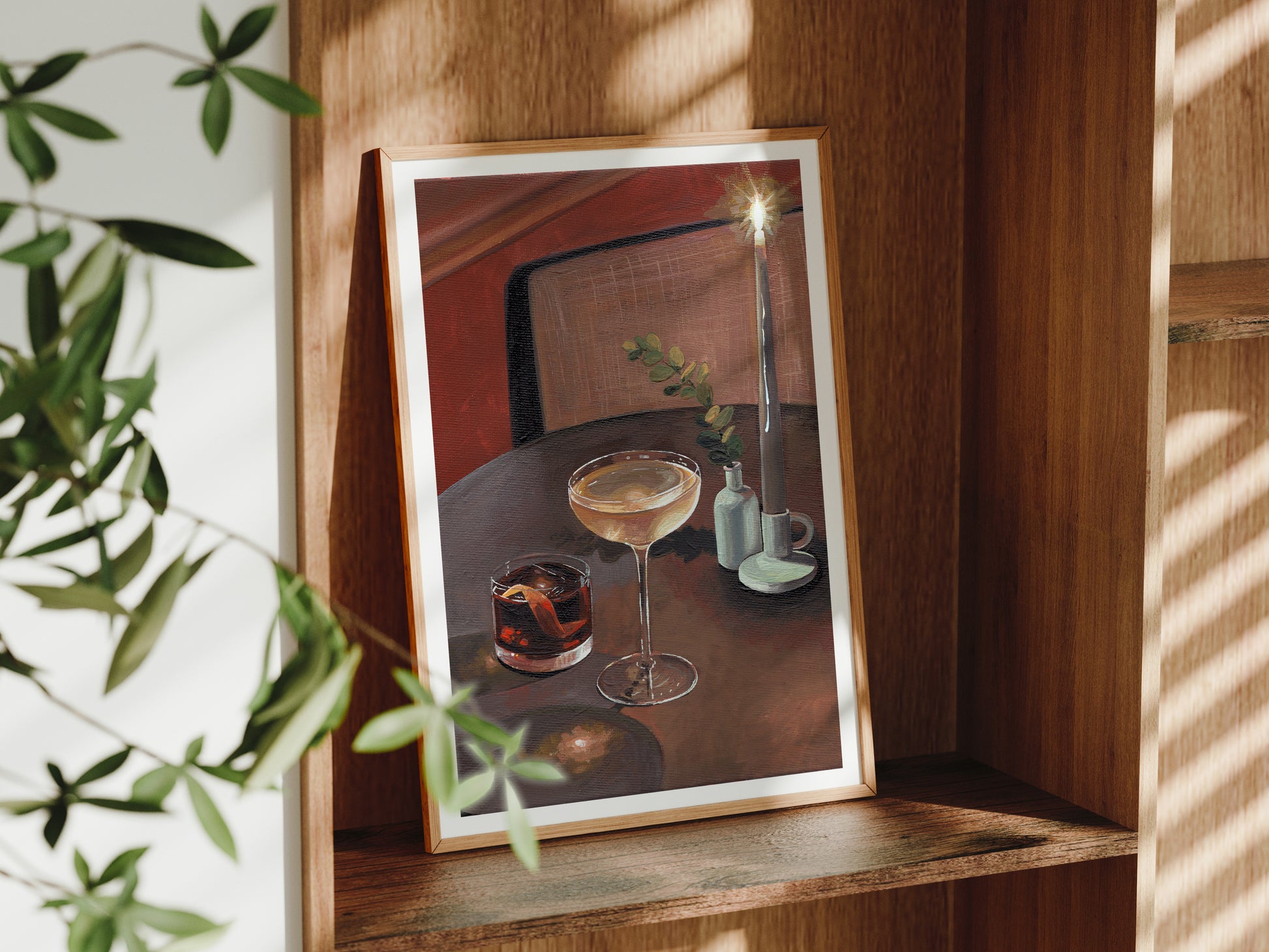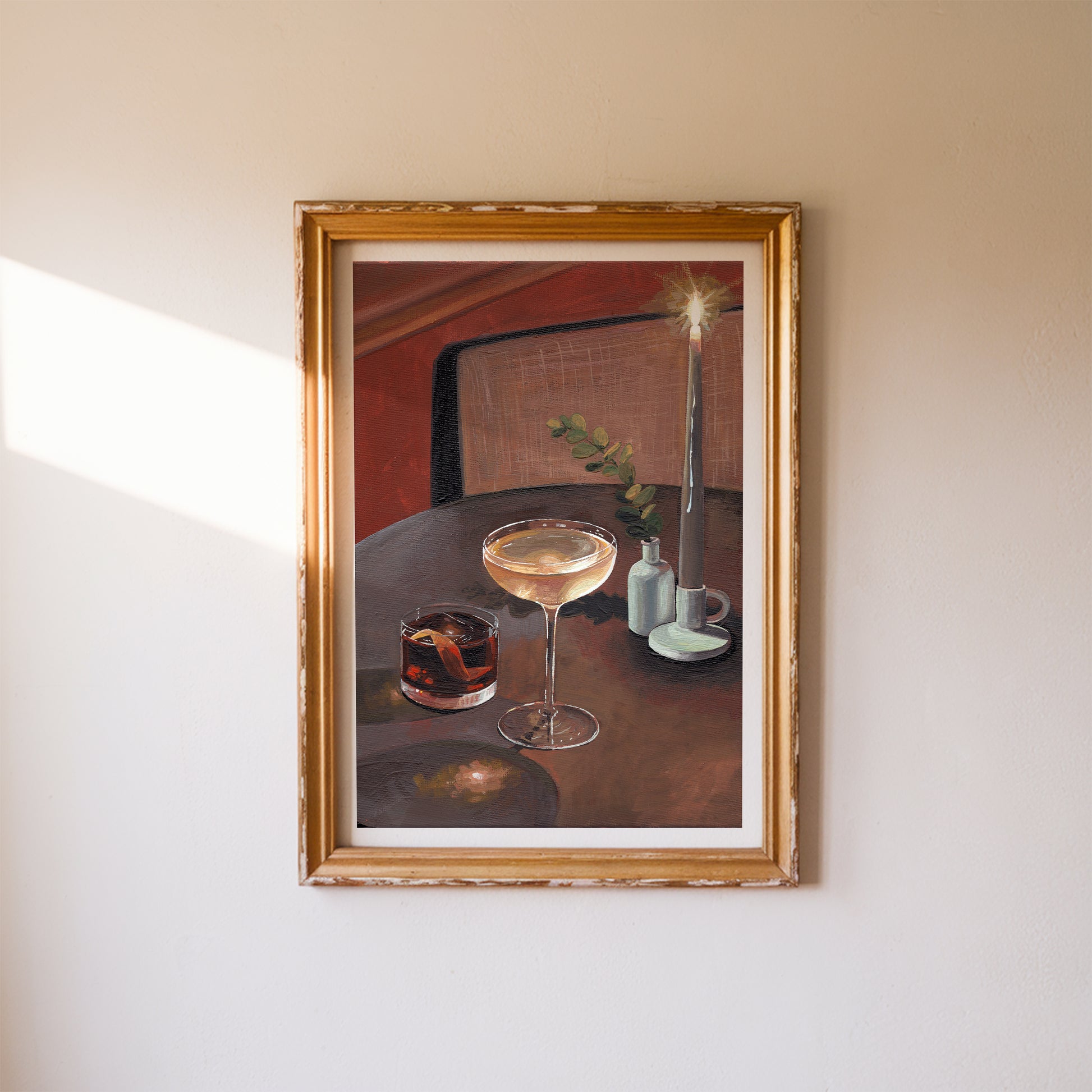 Inspired by the warmth of a candlelight on a rainy evening, this piece captures the quiet intimacy of two cocktails shared at a cosy table. An open edition fine art print, reproduced from an original gouache painting and printed on beautifully textured, artist-quality paper.
