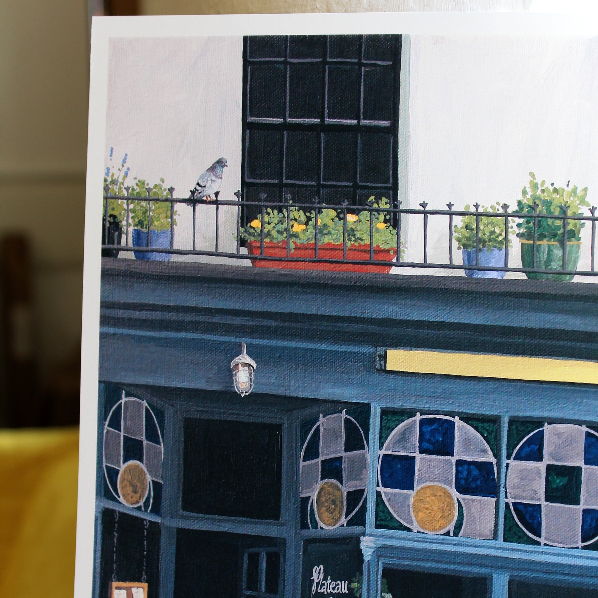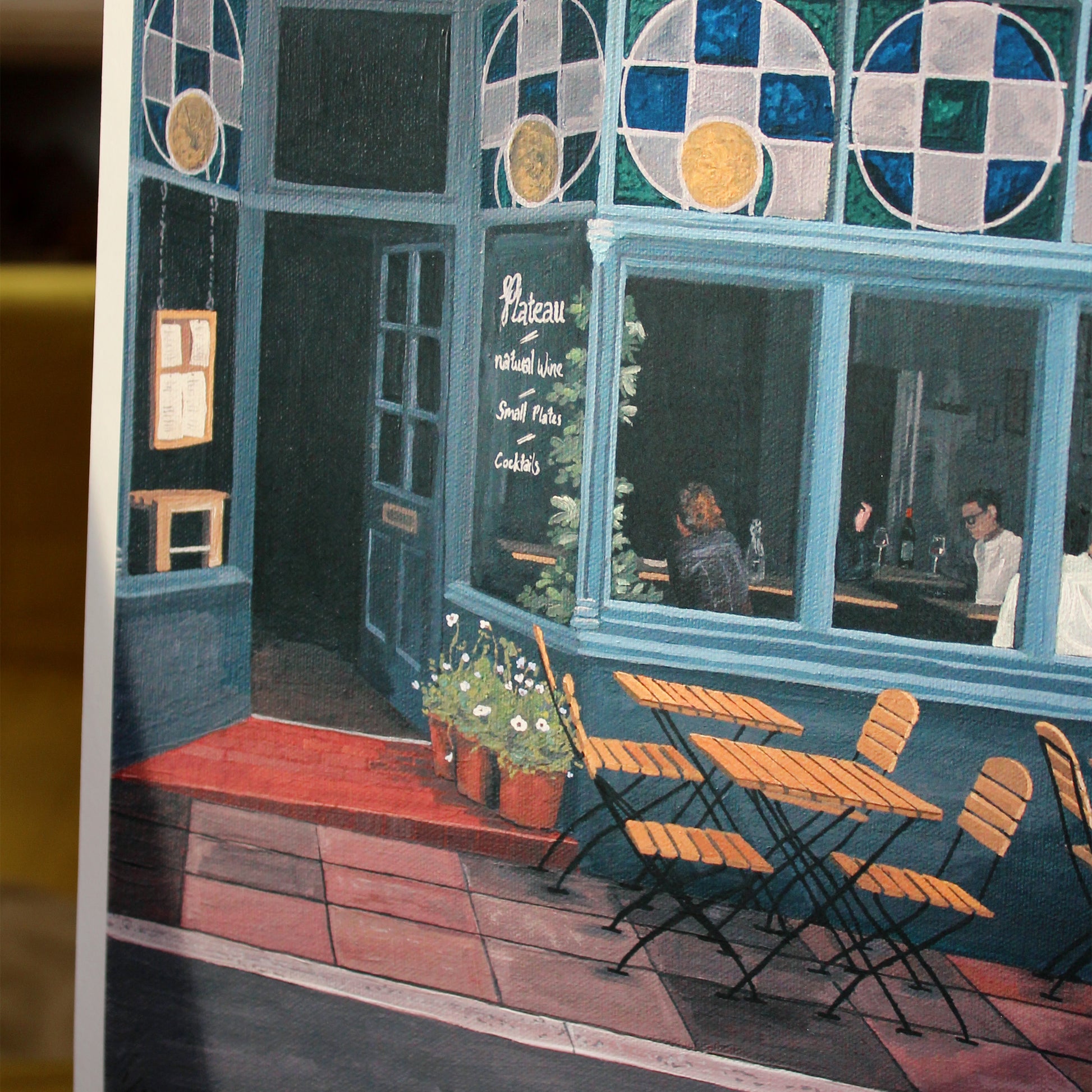 Inspired by Plateau– a natural wine bar adorned with stained glass windows and leafy potted plants. Through the window, a conversation unfolds over a bottle of wine, while a pigeon perches above the doorway. This limited edition fine art print captures the depth and detail of the original gouache painting, printed on beautifully textured, artist-quality paper.